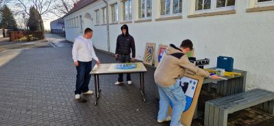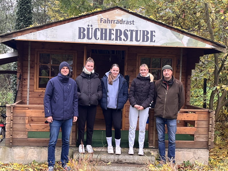 Am 8.11.24 fand die Einweihung Radlerrast mit Bücherstube am R1 in Hoym statt. Schüler der Klassen 10b und 8b waren bereits bei Restaurierung sehr aktiv. Heute unterstützen die Schüler der Klasse 8a den Verein Hoymat e.V. indem sie Kuchen und leckere Blätterteigtaschen zubereiteten. Diese wurden den Verein für die Ausgestaltung der Eröffnung übergeben. Weiterhin waren unsere Schulsprecherin und 2 weitere Schülerinnen vor Ort vertreten.